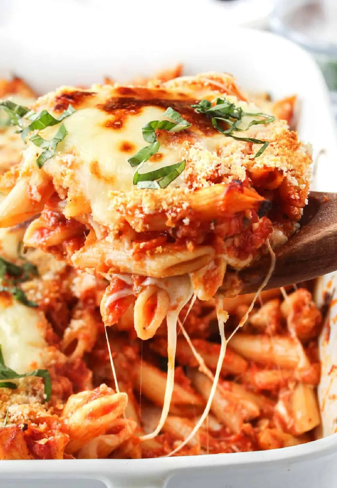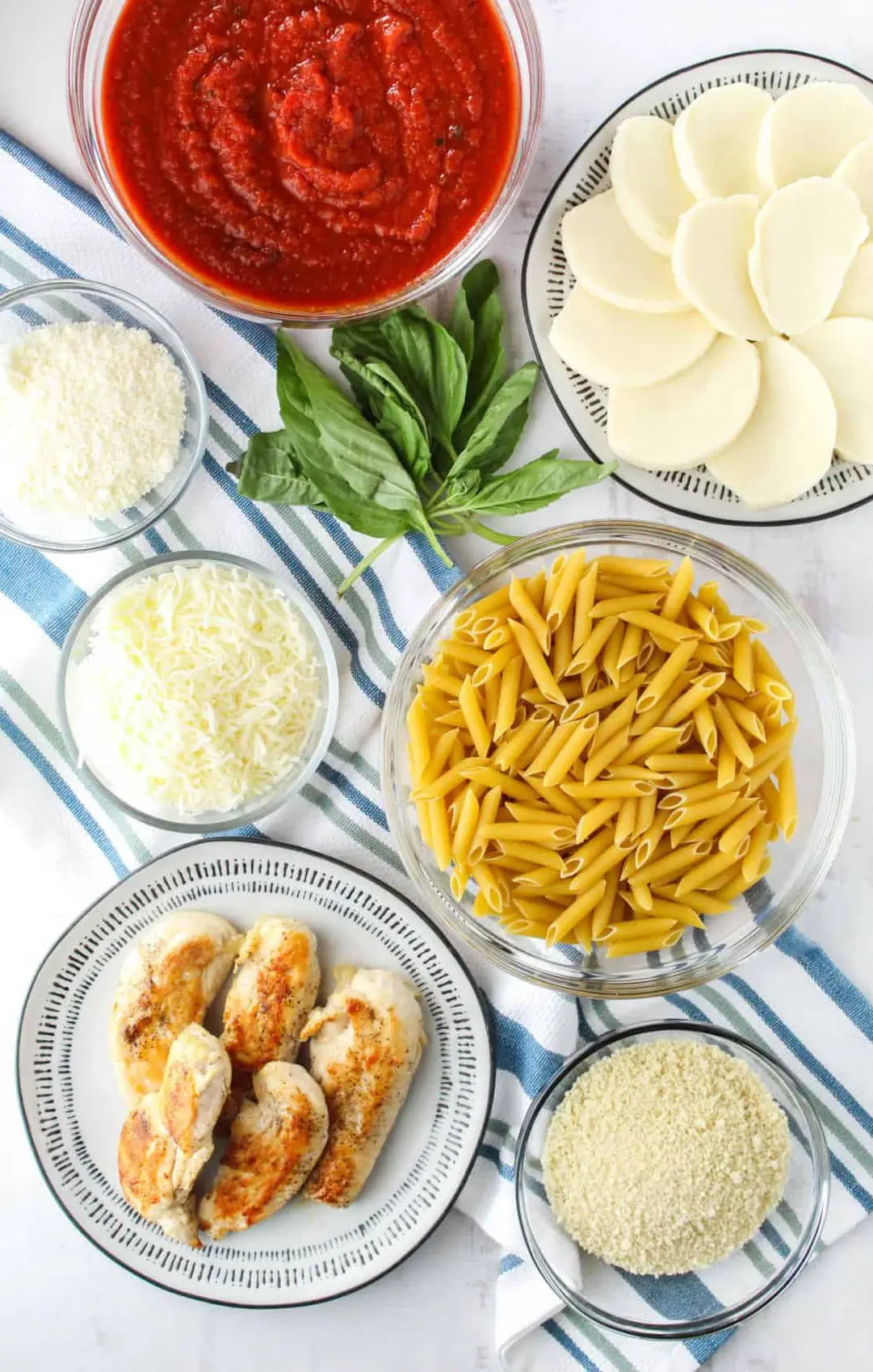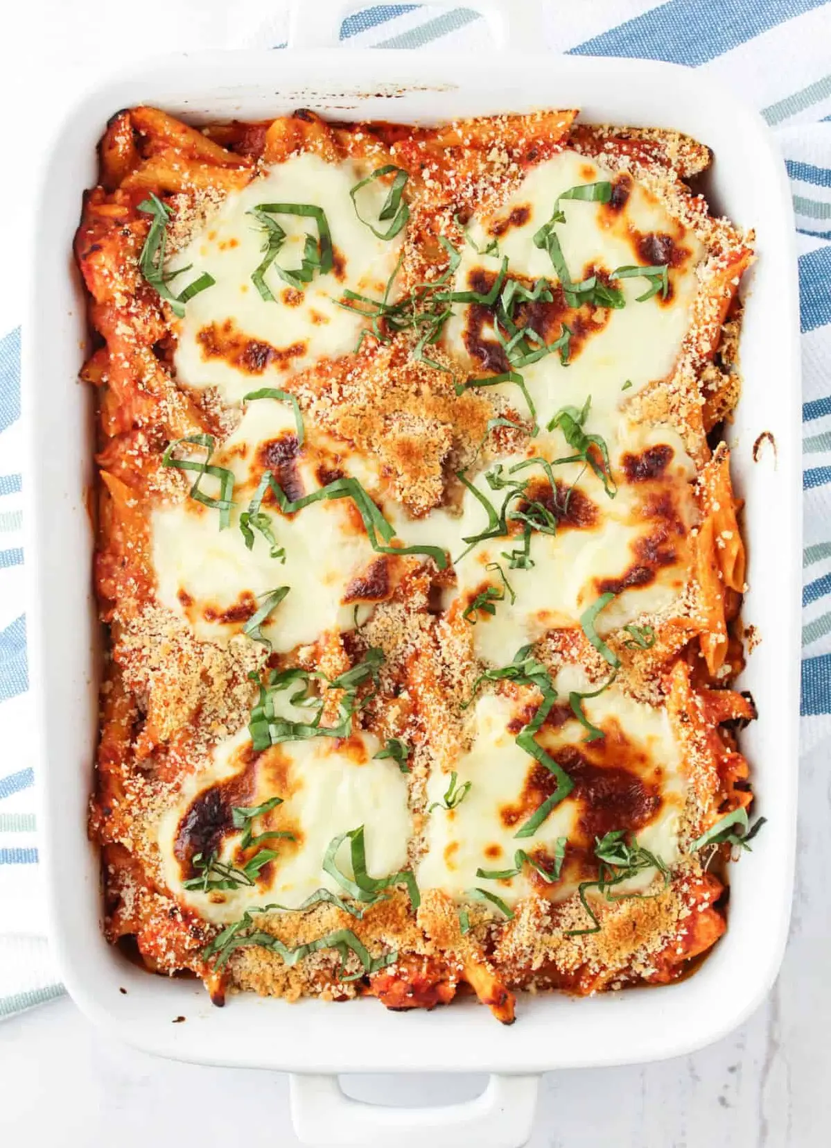 Baking dish: I use a long 9×13 baking dish for this baked chicken parmesan casserole. I prefer a ceramic baking dish because it heats evenly and makes the mozzarella cheese perfectly melted.