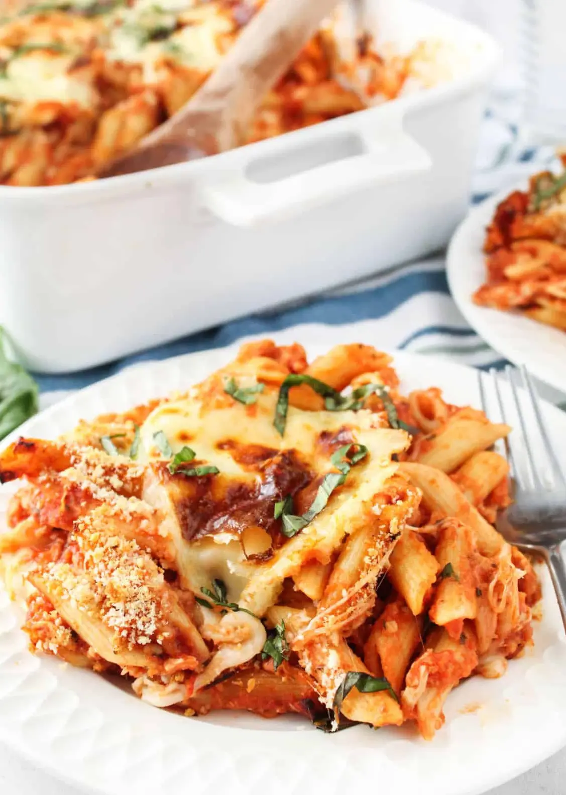 I like to garnish my easy chicken parmesan casserole with sliced fresh basil. You can always add parsley or even more Parmesan cheese, too!