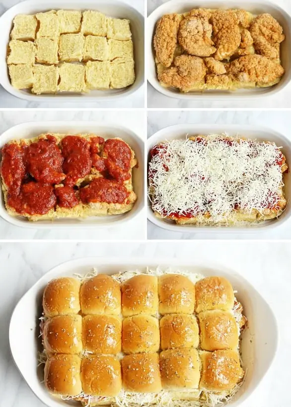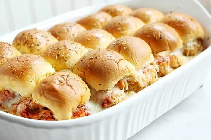 The first thing you have to do is make some really good chicken tenders. Now, I buy mine at the grocery store in the frozen food section because I like to keep things simple, but if you have a chicken tender recipe that you love, go for it! Once you’ve prepared your chicken tenders you need to put everything together. Cut your slider buns in half and place them in the bottom of a greased casserole dish. Then place your chicken tenders (already cooked) on the bottom buns, it’s ok if they cross over onto multiple buns you’ll cut the sliders apart before serving. Next, add a layer of your favorite spaghetti sauce, and then cover everything in lots of mozzarella cheese and Parmesan cheese. The cheesier the better if you ask me! Put the top buns in place and then pour melted garlic butter over everything and sprinkle it with a little Italian seasoning. That butter seeps into the bread as it cooks and turns it into an amazing garlic bread for your chicken Parmesan sliders.