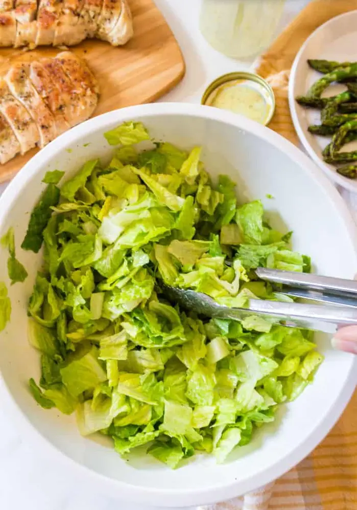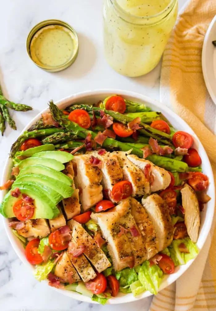 - Place lettuce in bowl, drizzle a bit of dressing over the lettuce and toss. Transfer to serving platter. Top with cherry tomatoes, asparagus, avocado and chicken. Sprinkle with bacon, drizzle over remaining dressing.