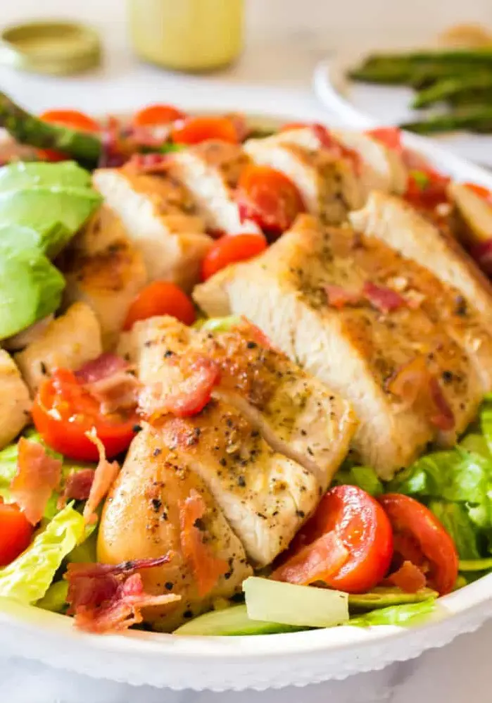 It’s filled with chicken, tomatoes, asparagus, Romaine lettuce, avocado, and bacon and dressed with an amazing homemade honey mustard dressing!